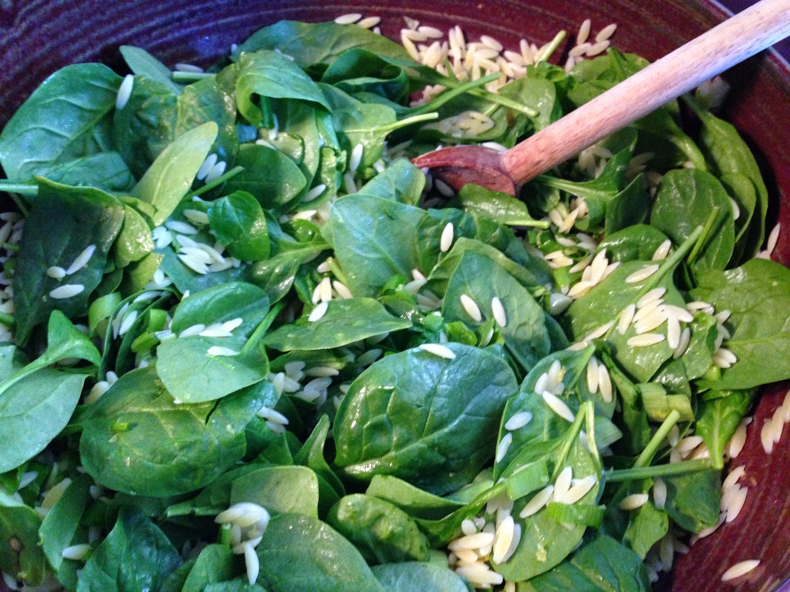 Toss orzo and caramelized onions together, then add 2 to 3 cups baby spinach